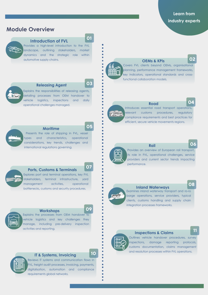 ”Finished Vehicle Logistics is a complex and critical part of the automotive value chain. The FVL Induction Course offers a fast and effective onboarding into our industry, providing participants with a clear end-to-end understanding of its key processes and stakeholders.